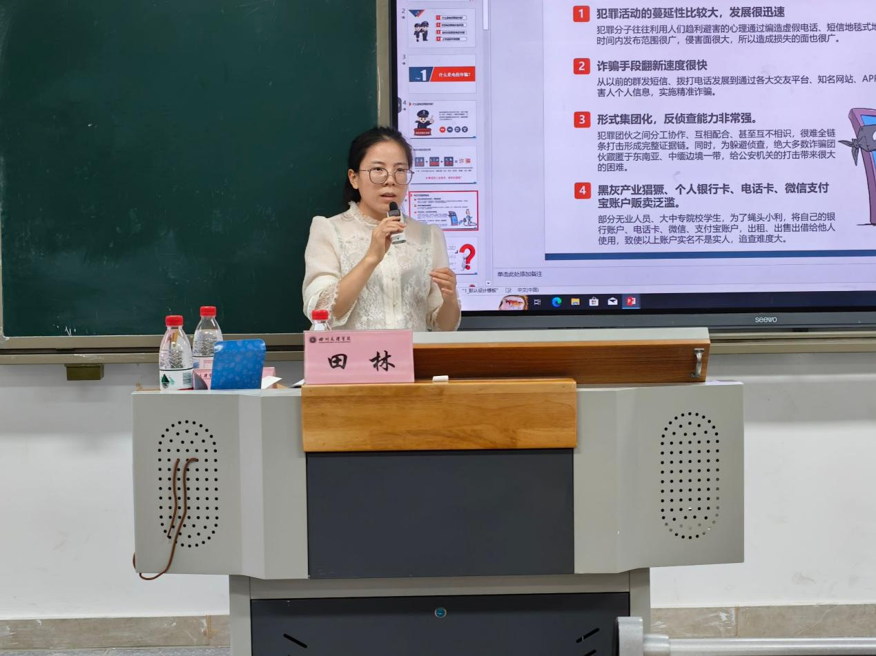 最后,田林重点围绕校纪校规、奖助政策、心理健康与安全教育等内容进行讲解。她结合真实案例,警示新生严格遵守考试纪律、注意宿舍用电安全、防范各类诈骗行为,并介绍了国家奖学金、助学金等评奖评优政策。她还鼓励同学们积极利用学校心理健康服务中心资源,保持良好心态,顺利度过大学生活适应期。