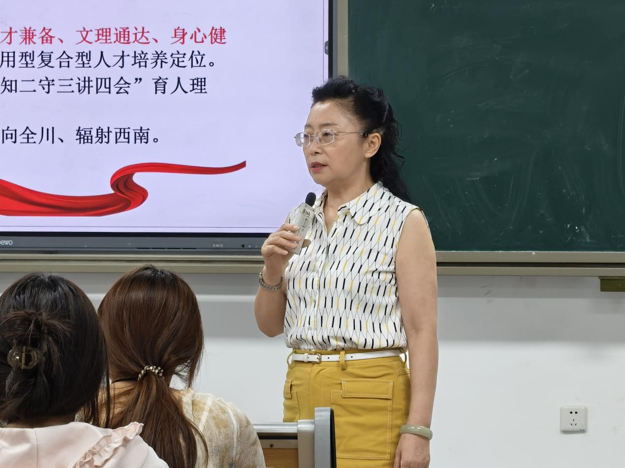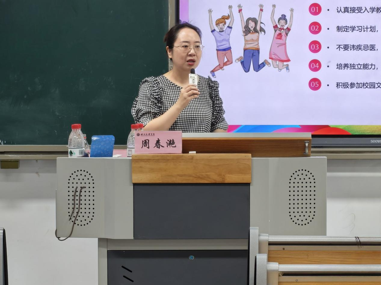 随后,周春滟就学业管理与大学生活适应发表讲话。她详细介绍了学分要求、学位授予条件及学业导师制度,提醒同学们合理规划选修课程,避免因学分不足影响毕业。此外,她还从心理调适、生活习惯、反诈防骗和职业规划等角度提出切实建议,引导大家尽快适应校园环境,养成健康作息,增强自我防范意识,并为未来职业生涯做好初步准备。